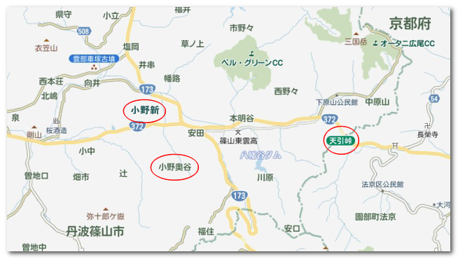 丹波篠山市内には、小野駅と長柄駅がありました。小野駅は小野新、小野奥谷が比定されています。