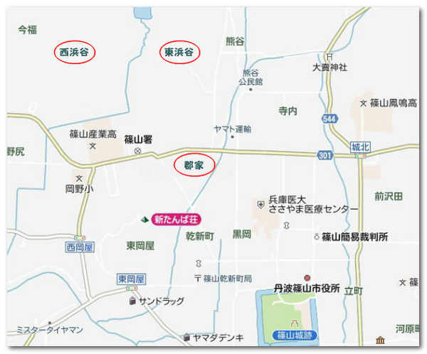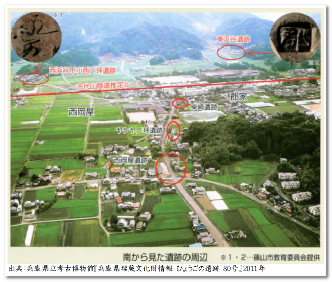 近くの東浜谷の遺跡からは「厨」と書かれた土器や「郡」と印刻された土器がが出土しています。このことと、近くに郡家という地名が残っていることから、東浜谷遺跡は、郡の役所である多紀郡衙の跡の可能性が高いと考えられています。