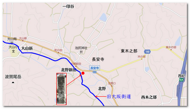 時代は近世になりますが、長安寺の交差点から旧国道に入った北野新田の三差路には、大坂街道と西京街道を示す文政4(1821)年の道標があります。