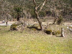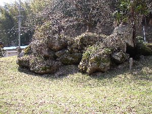 封土が失われ、石室が露出した状態で残る町浦古墳は、旧大坂街道沿いに所在していますが、不要な庭石が無造作に積んであるようにも見えますので、古墳であるということが地元の人にもあまり知られていません。『分布調査報告書』(1)にもその存在が示されているだけです。唯一『大山村史』(2)に詳しく書かれていますので、以下の数値はこれによります。