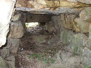 奥壁から6.5mから8.8mの間の幅は、1.7mに狭まり、高さは1.1mになります。また、天井石は4石あり、奥壁から4石めを他より50cm低く置いています。このことから『大山村史』は、この間を羨道せんどう、奥壁から6.5mまでを玄室として区切っています。