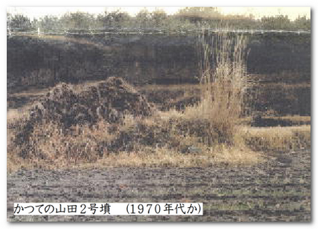 尚、『波賀尾群集墳分布調査報告書』(多紀郡教育事務組合教育委員会 1973年)は、「もとは径約20m前後の円墳であったようだが、昭和7年に田の拡大のため破壊された」としています。一方、『多紀郡埋蔵文化財分布調査報告書』(多紀郡埋蔵文化財調査委員会 1972年)は、半崩壊として「円墳(東西4.0m、南北8.0m、高1.5m)、横穴式石室」と報告しています。このページの最初の方に掲載した1970年代と思われる山田2号墳の写真が残っていますので、70年代に半崩壊状態で山田2号墳は残っていたと思われます。