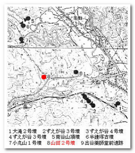 この流れの中に山田2号墳の被葬者はおかれていたと言えます。しかし、山田1号墳からは頭椎大刀(または双龍環頭大刀)が出土していますので、中央は、山田2号墳の被葬者の系統に、引き続きこの地の支配を認めたと思われます。
