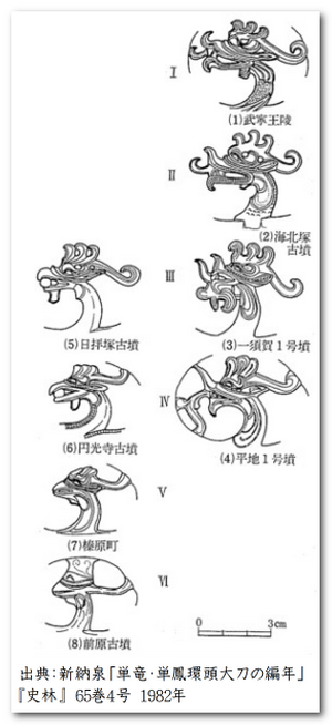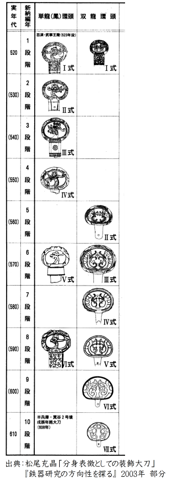 また、新納氏の「装飾付大刀編年表」をみると、平行する時期がありますが、単竜・単鳳環頭大刀の後に双竜・双鳳環頭大刀が盛行しているのがわかります。