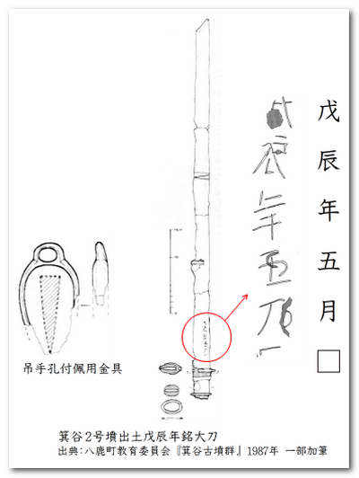 また、兵庫県養父市八鹿町小山の「箕谷2古墳」から出土した銘文大刀には、「戊辰年五月□」と記されています。干支の「戊辰」(つちのえたつ )の実年代は、6世紀と7世紀では、西暦548年、608年、668年にあたります。箕谷2号墳の他の出土品から判断して、大刀に記された戊辰年は、608年とするのが有力な説です。