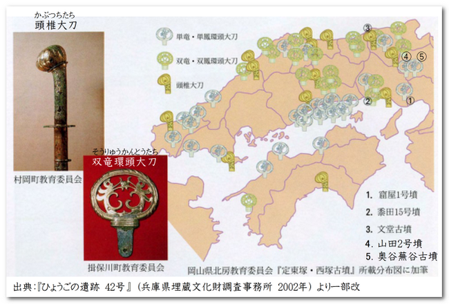 単鳳環頭大刀などの装飾付大刀は、中央から地方豪族に下賜されたものというのが有力な説です。特に、Ⅴ・Ⅵ式の時期には単鳳環頭大刀が量産されたようで、全国的に分布します。
