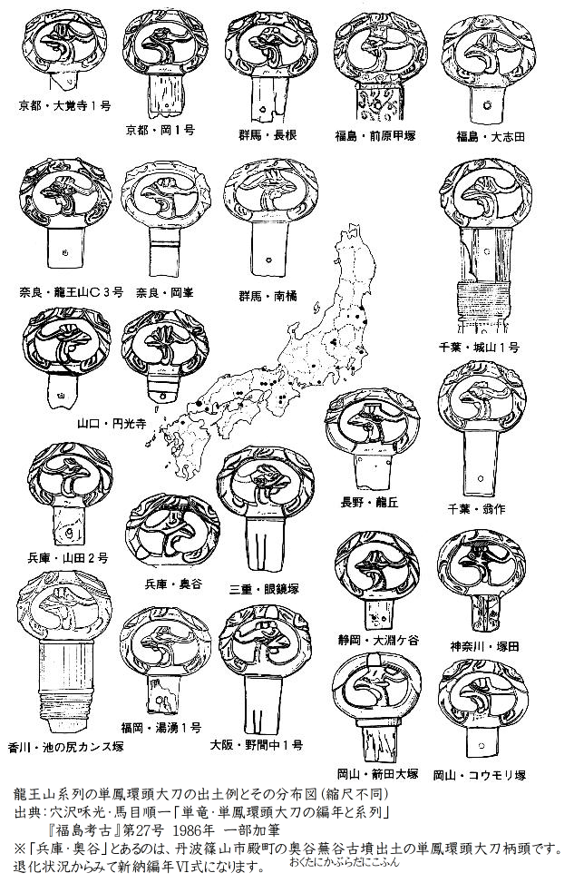 山田2号墳のものと類型式または同系列の分布を示しているのが下図です。穴沢・馬目氏はこのグループのルーツを龍王山C3号墳出土の単鳳環頭大刀とし、龍王山系列と仮称されています。そしてこの一系列のみが特に量産され、全国に配布されたとのではないかと考えられています。